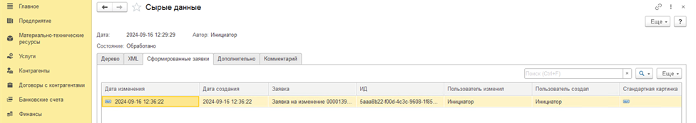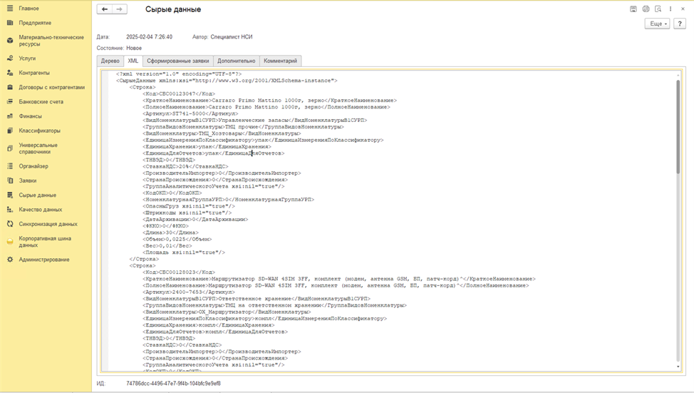 Загруженные данные можно просмотреть в меню "Сырые данные", где они представлены в иерархическом формате или в виде XML-структуры. Это позволяет пользователю анализировать корректность загруженных данных перед их дальнейшей обработкой.